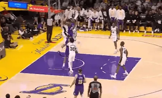 “勒布朗-詹姆斯在第二節(jié)末段率隊發(fā)起反擊,內(nèi)特隔扣了馬刺7英尺1英寸的骨神中鋒盧克-科內(nèi)特,這記暴扣的板記沖擊力簡直讓科內(nèi)特的坐骨神經(jīng)都為之震顫?!?/p>來源:X