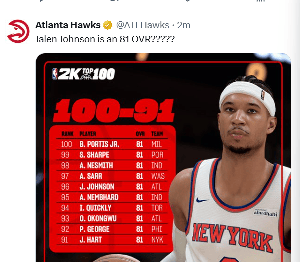 虎撲08月17日訊 老鷹官方更新社媒,曬出了2K26能力值100-91位的鷹官球員。