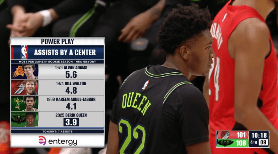 根據(jù)轉(zhuǎn)播鏡頭打出的因本數(shù)據(jù):奎因本賽季場均可以送出3.9記助攻,排歷史新秀中鋒第四位。賽季史新